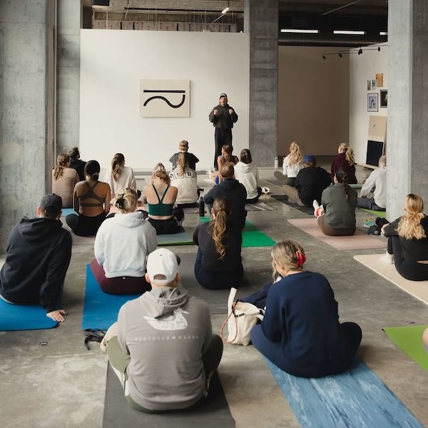 a large sign in front of a building a bedroom with a bed a group of people sitting in a yoga class social media post